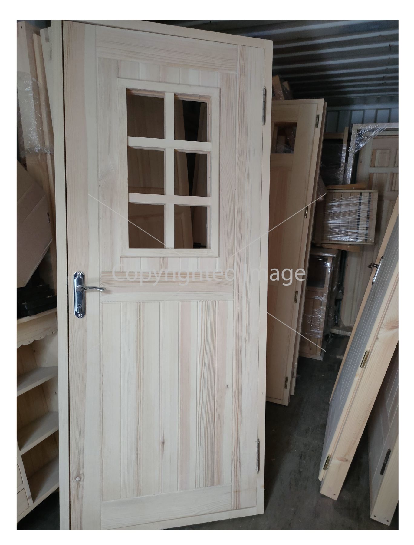 Дверной блок размером 2070х870 мм укомплектован ручкой (хром) ключ+ключ и навешен на петли ( 4 петли) ,дверной блок со стеклопакетом .Дверь толщиной 50 мм оснащена уплотнителем по контуру двери, собрана дверь из массива сосны, в производстве данной двери использовался, так называемый ''комель'' это нижняя часть ствола, в которой кольца древесные расположены намного плотнее друг к другу чем другой участок ствола дерева и делает материал из этой части более долговечный и стойкий к агрессивной среде,так как пористость в разы меньше и попадание влаги сокращаеться в разы. Под заказ